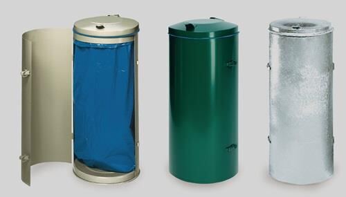 mit Einflügeltür · für den Außenbereich · aus Stahlblech mit festem Boden und Metalldeckel · pulverbeschichtet oder komplett feuerverzinkt · passend für 120-l-Kunststoff- oder Papiersäcke · Abfallsammler Maße 120 l - Ø 500 x H 980 mm Einfüllöffnung Maße 120 l - ca. Ø 390 mm Weitere technische Eigenschaften: · Ø: 500mm · Gewicht: 25kg · Einwurföffnung-Ø: 390mm
