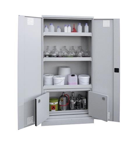 mit feuergeschützter Sicherheitsbox · zur Lagerung von wassergefährdenden, giftigen und sehr giftigen Flüssigkeiten, gem. TRGS 510, sowie für brennbare Flüssigkeiten nach EN 14470-1 / TRGS 510 / ISO 3864 / ASR A1.3 · Korpus aus Qualitätsstahlblech, einwandig mit hochwertiger Pulverbeschichtung in lichtgrau, RAL 7035 · Einlegewannen aus Stahlblech pulverbeschichtet in lichtgrau, RAL 7035, höhenverstellbar · abschließbar über Zylinderschloss · Zuluft über Lüftungsöffnungen in den Türen · zentraler Abluftanschluss durch Rohrstutzen DN 80 auf dem Schrankdach · geprüfte und zugelassene Gesamtkonstruktion nach EN 14470-1 (Typ 30 / Typ 60) mit einer Feuerwiderstandsfähigkeit von >30 Min. (Typ 30) bzw. >60 Min. (Typ 60) des Klein-Sicherheitsschrankes · Klein-Sicherheitsschrank - Türen separat abschließbar - mit Bodenwanne (BW) - Nutzmaße innen: H 440 x B 760 x T 340 mm - automatische Türschließung · Zubehör, wie zusätzliche Einlegewannen oder PE-Einsätze zur Lagerung von aggressiven Medien auf Anfrage! Weitere technische Eigenschaften: · Innenhöhe: 1240mm · Innentiefe: 467mm · Innenbreite: 862mm · prüfpflichtig: ja