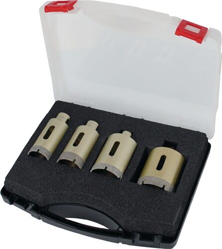 zum Bohren von sauberen, kantenscharfen Löchern in Feinsteinzeug, Steinplatten, Granitplatten, Fliesen, Keramik und Marmor · max. Bohrtiefe 70 mm · Segmenthöhe 15 mm · Inhalt: Diamantbohrkrone in Ø 35, 40, 50, 68 mmWeitere technische Eigenschaften:· Inhalt: 4-teilig
