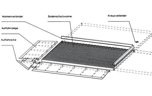 aus Stahl · Bauhöhe 78 mm · nach Übereinstimmungserklärung (ÜHP) gemäß StawaR, zugelassen für entzündbare Flüssigkeiten der GHS-Kategorien 1-3, gewässergefährdende Flüssigkeiten der GHS-Kategorien 1-4 · aus 3 mm Stahl · mit verzinktem Gitterrost, Tragfähigkeit 5000kg/m² (bei gleichmäßig verteilter Last) · mit Hubwagen und Stapler leicht befahrbar · Radlast max. 500 kg