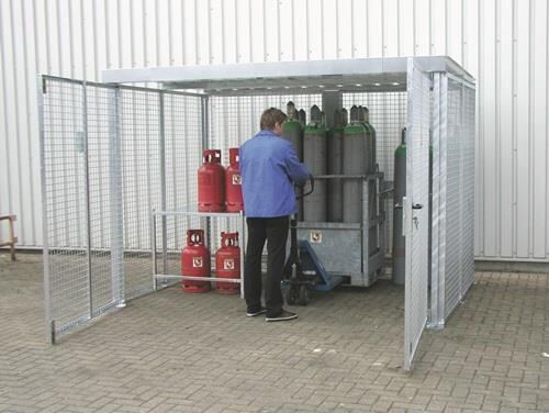 stabile, feuerverzinkte Rahmenkonstruktion nach TRGS-Richtlinie 510 · zur vorschriftsmäßigen Lagerung von Gasflaschen im Außenbereich · mit abschließbarem Doppel-Flügeltor · Dach aus beschichtetem Trapezblech (Schneelast 75 kg/m²) · zerlegte Anlieferung · die Lagerkapazität bezieht sich auf Gasflaschen mit Ø 230 mm