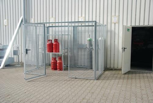 stabile, feuerverzinkte Rahmenkonstruktion nach TRG-Richtlinie 510 · zur vorschriftsmäßigen Lagerung von Gasflaschen im Außenbereich · mit abschließbarem Tor · Dach aus beschichtetem Trapezblech (Schneelast 75 kg/m²) · zerlegte Anlieferung · die Lagerkapazität bezieht sich auf Gasflaschen mit Ø 230 mm
