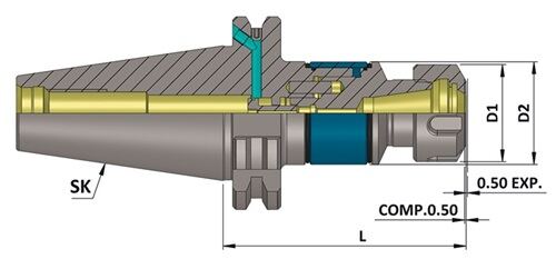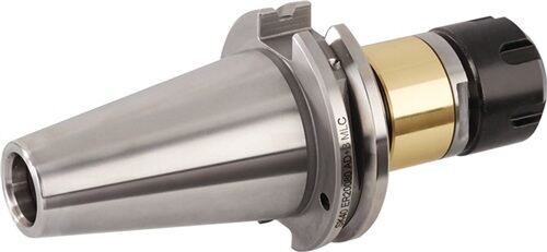 Synchron · mit Steilkegel DIN 69871 AD/B · mit Kühlmittelzuführung · zum Ausgleich von Steigungsdifferenzen des Gewindeschneidwerkzeuges und der Synchronspindel · zum Einsatz auf CNC-Maschinen mit Synchron-Gewindeschneideinrichtung · das Futter kann Synchronisationsfehler auf Druck und Zug ausgleichen (+/- 0,5 mm) · Einsatz für Rechts- und Linksgewinde · hohe Rundlaufgenauigkeit · hohe Spannkraft durch Spannung in Gewindebohrerspannzangen mit integriertem Vierkant · Weitere technische Eigenschaften L: 84mm • D1: 42mm • D2: 45mm • Schaft: SK40