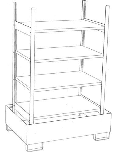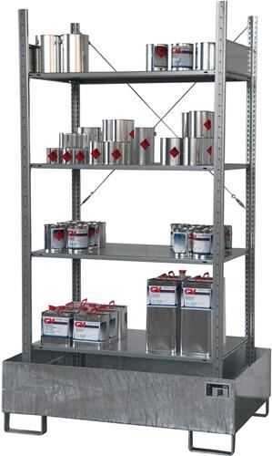 für Kleingebinde, mit Auffangwanne · baugleiches Regal wie Art.-Nr. 9130 466832-9130 466835 · Auffangwannen aus Stahl, geschweißt und verzinkt · Lagerung von gewässergefährdenden Flüssigkeiten der GHS-Kategorien 1-4 und von entzündbaren Flüssigkeiten der GHS-Kategorien 1-3