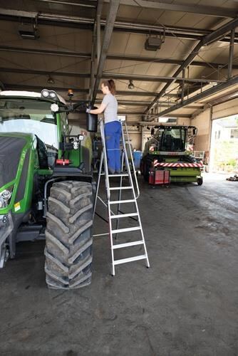 aus Aluminium · stabile Rechteckrohr-Holme, konische Holmführung · 4-fach gebördelte Stufen-/Holmverbindung · geriffelte Stufen (T. 80 mm), Stufenabstand 235 mm · Leiterneigung: 70° · max. Belastung 150 kg · Höhe der Teilumwehrung 1000 m · große trapezförmige Plattform (400 / 360 x 425 mm) · mit 2 vormontierten Handläufen für sicheren Auf- und Abstieg, Leitergelenk 'safe-cap' · rutschsichere Leiterschuhe und Spreizsicherung mit zwei hochfesten Polyestergurten Weitere technische Eigenschaften: · Gesamthöhe: 2880mm · Ausführung: einseitig begehbar · Höhe: 2880mm · Arbeitshöhe bis ca.: 3800mm · Länge geklappt: 3060mm · prüfpflichtig: ja · Gesamtlänge: 3050mm · Höhe Plattform bis Geländerrohr: 1000mm · Holmhöhe: 73mm · Holmhöhe des Stützteils: 58mm · Länge Handlauf: 1770mm · Leiterverwendung (DIN EN 131): Professionell · Neigung: 70° · Schrittlänge: 1613mm · Standplattform als Stufe gezählt: Ja · Tritt-Ausführung: Stufen