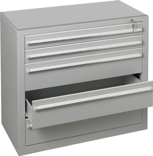 Stahlblechkonstruktion pulverbeschichtet, lichtgrau RAL 7035 · Schubladen mit 90% Einfachauszug, Tragfähigkeit 70 kg und Einzelauszugsperre · Griffleisten mit Beschriftungsstreifen · Schubladen-Innenmaße B 856 x T 425 mm · Lieferung inklusive Abdeckboden · kombinierbar mit der Flügeltür H 1000 mm zur Integration in das Steckregalsystem Weitere technische Eigenschaften: · Schubladeninnentiefe: 425mm · Schubladeninnenbreite: 856mm