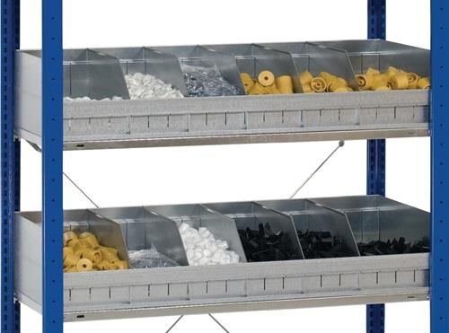 Verzinkt · werden einfach auf die Fachböden gestellt · Höhe vorne 100 mm, hinten 200 mm · mindestens 1 Trennblech pro Mulde erforderlich · Breite 1000 mm Weitere technische Eigenschaften: · Oberfläche: verzinkt