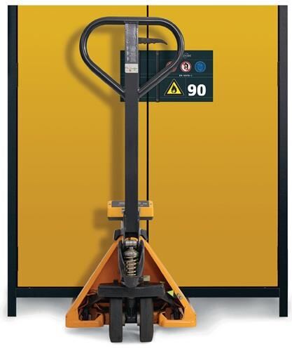 zur sicheren und vorschriftmäßige Lagerung von entzündbaren Gefahrstoffen nach DIN EN 14470-1 und TRGS 510 · Feuerwiderstandsfähigkeit 90 Minuten, GS-geprüft · extrem robuste Bauweise mit maximale Verwindungssteifigkeit · kratzunempfindliche Strukturlackierung · abschließbar mit Profilzylinderschloss und Anzeige des Schließzustandes, eine Integration in eine Schließanlage ist möglich · leichte Handhabung, mit einer Hand zwei Türen öffnen · Türen arretieren in der serienmäßigen Feststellanlage für einfaches Ein- und Auslagern · Türen immer geschlossen halten, durch die serienmäßige Tür-Schließ-Automatik schließen die arretierten Türen nach ca. 60 Sekunden · Bodenwanne (geprüft nach StawaR/ÜHP) inkl. Lochblecheinsatz und 3 Fachböden · Fachböden im Raster von 32 mm höhenverstellbar, Tragfähigkeit 75 kg bei gleichmäßig verteilter Last · mit integrierter Thermoauslösung die im Brandfall selbsttätiges Schließen der Türen garantiert · unterfahrbarer Sockel zum einfacher Transport des Schrankes ohne Palette · Sockelblende verschließt den Sockel bei Nichtgebrauch (Zubehör) Weitere technische Eigenschaften: · Innenhöhe: 1647mm · Innentiefe: 522mm · Innenbreite: 750mm · Gewicht: 343kg · Variante: TSA