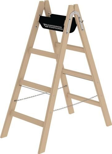 Holme aus Kiefer/Fichte oder astfreier Carolina-Pine, Sprossen aus Buche gefertigt · verzapfte Sprossen-/Holmverbindung, dadurch glatte Holmoberfläche · stabiles Stahl-Hufeisenscharnier · serienmäßig mit praktischem Eimerhaken ausgestattet · hohe Standsicherheit durch Spreizsicherung mit 2 verzinkten Stahlketten · Anwendung: Für die Verwendung der Stehleiter als Verkehrsweg oder Arbeitsplatz sind die Vorgaben der TRBS 2121 Teil 2 zu beachten. Weitere technische Eigenschaften: · Ausführung: beidseitig begehbar · prüfpflichtig: ja