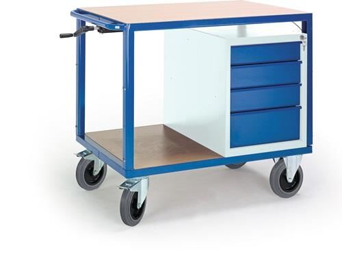 mit Höhenverstellung mittels Handkurbel, optimal einstellbare Arbeitshöhe für jeden Anwender · obere Ladefläche stufenlos höhenverstellbar von 980-1280 mm, für die Absenkung der Ladefläche ist eine Mindestbelastung von 40 kg notwendig · robuste Winkelstahlkonstruktion, pulverbeschichtet enzianblau, RAL 5010 · Schubladenschrank: Korpus lichtgrau, RAL 7035, Front enzianblau, RAL 5010 · mit 4 Schubladen H 1 x 85,1x160, 2 x 100 mm, Schubladen Innenmaße B 410 x T 640 mm, Tragfähigkeit pro Schublade 35 kg · Ladeflächen aus Holzwerkstoffplatten Oberfläche Buchedekor, L1090 x B700 mm · mit Schiebebügel · TPE-Bereifung, Rad-Ø 200 mm, Naben mit Rillenkugellager · 2 Lenk- und 2 Bockrollen, Lenkrollen mit Feststeller · Gesamtmaße L 1160 x B 700 x H 1280 mm · Tragfähigkeit obere Ladefläche 350 kg · Gesamttragfähigkeit 400 kg Weitere technische Eigenschaften: · Anzahl Flügeltüren: 1 · Ladeflächenlänge: 1090mm · Ladeflächenbreite: 700mm · Tragfähigkeit pro Schublade: 35kg · Oberfläche: pulverbeschichtet · Schubladen-Innenmaße B x T: 410 x 640mm · Bereifung: TPE · Arbeitshöhe: 980-1280mm · Rad-Ø: 200mm