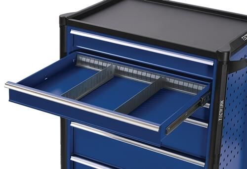 mit 6 Schubladen · Handgriff · kugelgelagerte, mit Teleskopschienen herausziehbare Schubladen mit 100 % Auszug mit jeweils einer Antirutschmatte · automatischer Schubladeneinzug · lackierte Metallabdeckung · Einteilerset für 4 Schubladen im Lieferumfang enthalten · abschließbar mittels eingebauten seitlichem Zylinderschloss mit 2 Schlüsseln · hochwertige Rollen Ø 127 mm – 2 starre und 2 lenkbare Rollen mit Feststellung · beidseitiges Lochwandsystem (9 x 9 mm) für einfache Installation von Zubehörartikeln · durchgehender, seitlicher Kunststoffkantenschutz Maß über alles aufgebaut mit Griff und Rädern (B x T x H) 745 x 475 x 950 mm Maß nur Korpus (B x T x H) 678 x 459 x 781 mm Innenmaß Schubladen (B x T x H) 3 x 568 x 398 x 75 mm Innenmaß Schubladen (B x T x H) 3 x 568 x 398 x 154 mm Tragkraft pro Schublade 25 kg / statische Gesamtbelastbarkeit 300 kg Weitere technische Eigenschaften: · Anzahl Längsteiler: 8 · Anzahl Querteiler: 8 · Gewicht: 63kg · Schubladeninnentiefe: 398mm · Schubladeninnenbreite: 568mm · Schubladenhöhe: 75mm,154mm