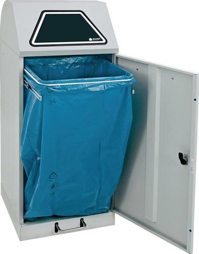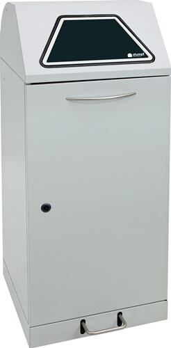 Stahlblech pulverbeschichtet · Korpus lichtgrau, RAL 7035 · feuer- und geruchshemmend · flüssigkeitsdicht im Bodenbereich · Flügeltür mit Magnetverschluss und Vierkantverriegelung · selbstschließende Einwurfklappen mit Kantenschutz, Bedienung erfolgt von Hand oder durch Trethebel-Mechanik · mit ausziehbarer Abfallsackhalterung, rollengelagert für 100 % Auszug oder verzinktem Innenbehälter · Stellschraube im Bodenbereich gewährleistet einen sicheren Stand · Kennzeichnungs-Etiketten mit Aufschrift inkl. Piktogramme nicht im Lieferumfang enthalten · · Inhalt 120 l - H 900 x B 400 x T 380 mm