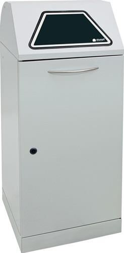 Stahlblech pulverbeschichtet · Korpus lichtgrau, RAL 7035 · feuer- und geruchshemmend · flüssigkeitsdicht im Bodenbereich · Flügeltür mit Magnetverschluss und Vierkantverriegelung · selbstschließende Einwurfklappen mit Kantenschutz, Bedienung erfolgt von Hand oder durch Trethebel-Mechanik · mit ausziehbarer Abfallsackhalterung, rollengelagert für 100 % Auszug oder verzinktem Innenbehälter · Stellschraube im Bodenbereich gewährleistet einen sicheren Stand · Kennzeichnungs-Etiketten mit Aufschrift inkl. Piktogramme nicht im Lieferumfang enthalten · · Inhalt 120 l - H 900 x B 400 x T 380 mm