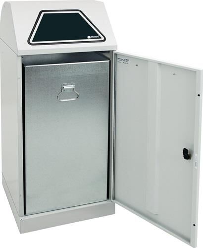 Stahlblech pulverbeschichtet · Korpus lichtgrau, RAL 7035 · feuer- und geruchshemmend · geprüft selbstlöschend (nur Ausführung mit verzinktem Innenbehälter) · Innenbehälter aus verzinktem Stahlblech · flüssigkeitsdicht im Bodenbereich · Flügeltür mit Magnetverschluss und Vierkantverriegelung · selbstschließende Einwurfklappen mit Kantenschutz, Bedienung erfolgt von Hand oder durch Trethebel-Mechanik · mit ausziehbarer Abfallsackhalterung, rollengelagert für 100 % Auszug oder verzinktem Innenbehälter · Stellschraube im Bodenbereich gewährleistet einen sicheren Stand · Kennzeichnungs-Etiketten mit Aufschrift inkl. Piktogramme nicht im Lieferumfang enthalten · · Inhalt 120 l - H 900 x B 400 x T 380 mm