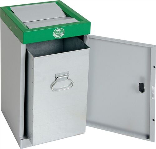 aus verzinktem und hochwertigem strukturpulverbeschichtetem Qualitätsstahlblech · schlag- und kratzfest · Brandschutzklasse A1 bzw. DIN EN 13501-1 gegeben · selbstlöschend nach Prüfprogramm M0307 · selbstschließende Schwingdeckel · Inneneinsatz aus verzinktem Stahlblech · Entleerung durch Flügeltür an der Frontseite · Türverriegelung durch Vierkantschloss, Lieferung erfolgt inklusive Schlüssel · Piktogramme sind im Lieferumfang nicht enthalten