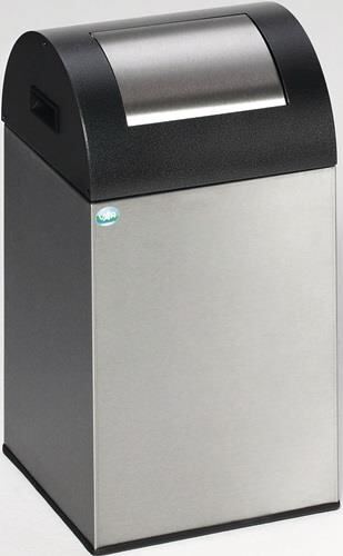 Inhalt 43 l · aus verzinktem und pulverbeschichtetem Stahlblech oder Edelstahl · Schlag- und kratzfest · Kopfteil mit selbstschließende Einwurfklappe und praktischen Griffmulden · Entleerung durch abnehmbares Kopfteil · mit Klemmring zur Aufnahme von Abfallsäcken · Bodenschonender Kantenschutz · H 600 x B 320 x T 320 mm
