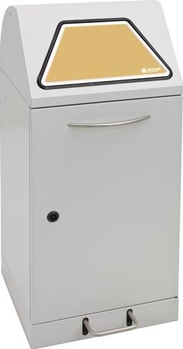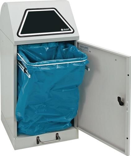 Stahlblech pulverbeschichtet · Korpus lichtgrau, RAL 7035 · feuer- und geruchshemmend · flüssigkeitsdicht im Bodenbereich · Flügeltür mit Magnetverschluss und Vierkantverriegelung · selbstschließende Einwurfklappen mit Kantenschutz, Bedienung erfolgt von Hand oder durch Trethebel-Mechanik · mit ausziehbarer Abfallsackhalterung, rollengelagert für 100 % Auszug oder verzinktem Innenbehälter · Stellschraube im Bodenbereich gewährleistet einen sicheren Stand · Kennzeichnungs-Etiketten mit Aufschrift inkl. Piktogramme nicht im Lieferumfang enthalten · · Inhalt 60 l - H 900 x B 400 x T 400 mm