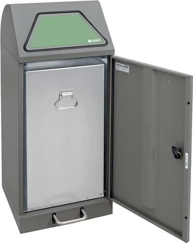 Stahlblech pulverbeschichtet · Korpus graualu-Struktur · feuer- und geruchshemmend · geprüft selbstlöschend (nur Ausführung mit verzinktem Innenbehälter) · Innenbehälter aus verzinktem Stahlblech oder Edelstahl · flüssigkeitsdicht im Bodenbereich · Flügeltür mit Magnetverschluss und Vierkantverriegelung · selbstschließende Einwurfklappen mit Kantenschutz, Bedienung erfolgt von Hand oder durch Trethebel-Mechanik · mit ausziehbarer Abfallsackhalterung, rollengelagert für 100 % Auszug oder verzinktem Innenbehälter · Stellschraube im Bodenbereich gewährleistet einen sicheren Stand · Kennzeichnungs-Etiketten mit Aufschrift inkl. Piktogramme nicht im Lieferumfang enthalten · · Inhalt 60 l - H 900 x B 400 x T 380 mm · Inhalt 75 l - H 1000 x B 400 x T 380 mm · Inhalt 120 l - H 1100 x B 450 x T 450 mm
