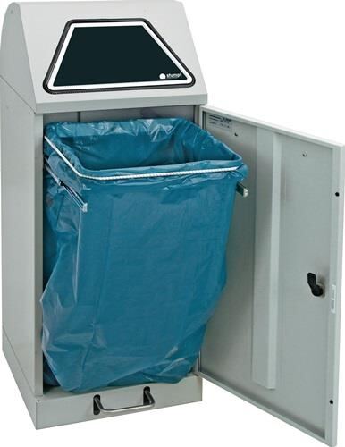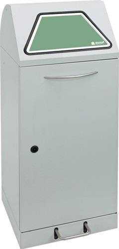 Stahlblech pulverbeschichtet · Korpus lichtgrau, RAL 7035 · feuer- und geruchshemmend · flüssigkeitsdicht im Bodenbereich · Flügeltür mit Magnetverschluss und Vierkantverriegelung · selbstschließende Einwurfklappen mit Kantenschutz, Bedienung erfolgt von Hand oder durch Trethebel-Mechanik · mit ausziehbarer Abfallsackhalterung, rollengelagert für 100 % Auszug oder verzinktem Innenbehälter · Stellschraube im Bodenbereich gewährleistet einen sicheren Stand · Kennzeichnungs-Etiketten mit Aufschrift inkl. Piktogramme nicht im Lieferumfang enthalten · · Inhalt 75 l - H 900 mm x B 400 x T 380 mm