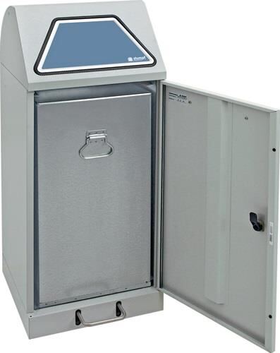Stahlblech pulverbeschichtet · Korpus lichtgrau, RAL 7035 · feuer- und geruchshemmend · geprüft selbstlöschend (nur Ausführung mit verzinktem Innenbehälter) · Innenbehälter aus verzinktem Stahlblech · flüssigkeitsdicht im Bodenbereich · Flügeltür mit Magnetverschluss und Vierkantverriegelung · selbstschließende Einwurfklappen mit Kantenschutz, Bedienung erfolgt von Hand oder durch Trethebel-Mechanik · mit ausziehbarer Abfallsackhalterung, rollengelagert für 100 % Auszug oder verzinktem Innenbehälter · Stellschraube im Bodenbereich gewährleistet einen sicheren Stand · Kennzeichnungs-Etiketten mit Aufschrift inkl. Piktogramme nicht im Lieferumfang enthalten · · Inhalt 75 l - H 900 x B 400 x T 380 mm