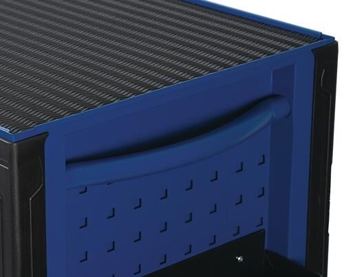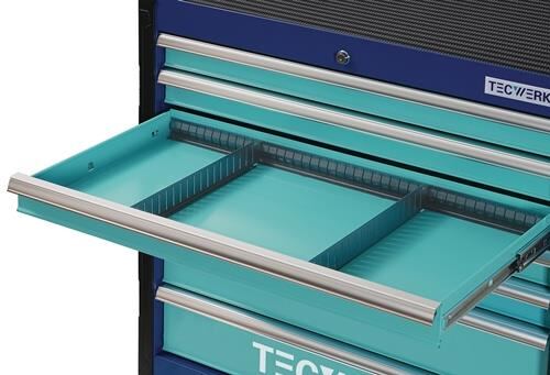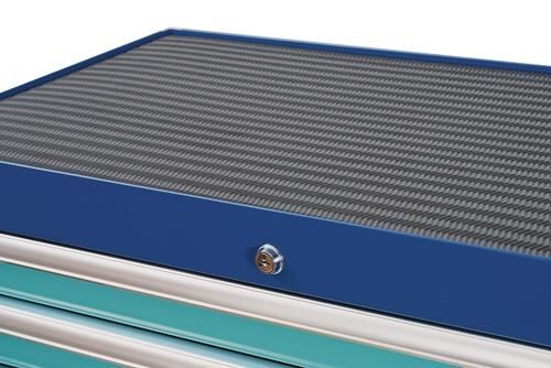 mit 7 Schubladen · Handgriff · kugelgelagerte, mit Teleskopschienen herausziehbare Schubladen mit 100 % Auszug mit jeweils einer Antirutschmatte · automatischer Schubladeneinzug · Einteilerset für 4 Schubladen enthalten · abschliessbar mittels eingebauten Zylinderschloss mit 4 Schlüsseln · mit Zentralverriegelung (nur eine Schublade kann gleichzeitig geöffnet werden) · beschriftbare Schubladen · hochwertige PVC-Rollen Ø 127 mm – 2 starre und 2 lenkbare Rollen mit Feststellung · beidseitiges Lochwandsystem (9 x 9 mm) für einfache Installation von Zubehörartikel · Vollauszug der Schubladen · 2 Dosenhalter mit Lochung für Schraubendreher (im Lieferumfang enthalten) · strapazierfähige Ablagematte · durchgehender, seitlicher Kantenschutz Maß über alles aufgebaut mit Griff und Rädern (B x T x H) 960 x 465 x 1020 mm Maß nur Korpus (B x T x H) 933 x 459 x 859 mm Innenmaß Schubladen (B x T x H) 5 x 823 x 398 x 75 mm Innenmaß Schubladen (B x T x H) 2 x 823 x 398 x 154 mm Tragkraft pro Schublade 30 kg / statische Gesamtbelastbarkeit 500 kg · Lieferung ohne Werkzeug/Inhalt Weitere technische Eigenschaften: · Anzahl Längsteiler: 8 · Anzahl Querteiler: 8 · Gewicht: 76kg · Schubladeninnentiefe: 398mm · Schubladeninnenbreite: 568mm · Schubladenhöhe: 75 mm,154mm